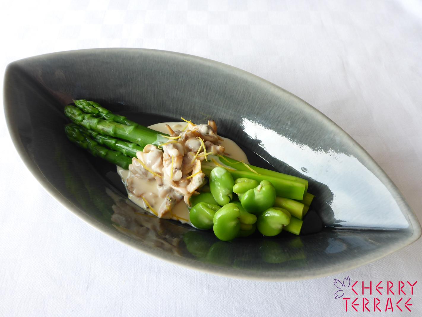 - 器にアスパラガスを盛り、3のソースをかけ、レモンの皮を散らす。