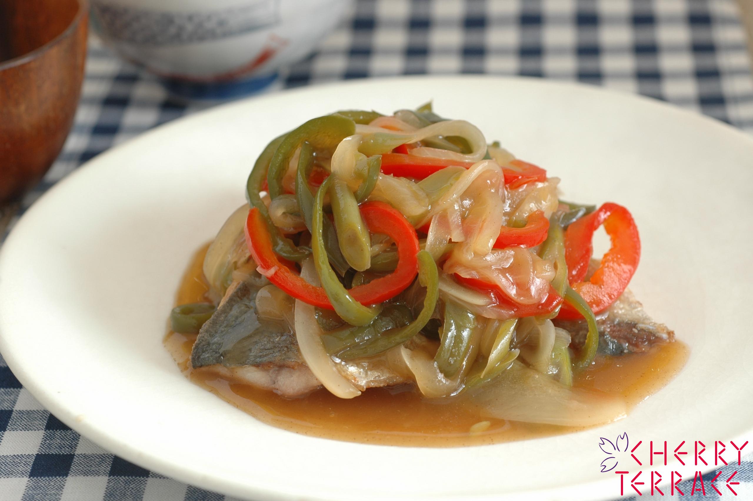 • 空いた鍋で玉ねぎとパプリカ、ピーマンを炒め、<A>を加えて煮立てる。水溶き片栗粉でとろみをつけ、2のあじの上にたっぷりとかける。