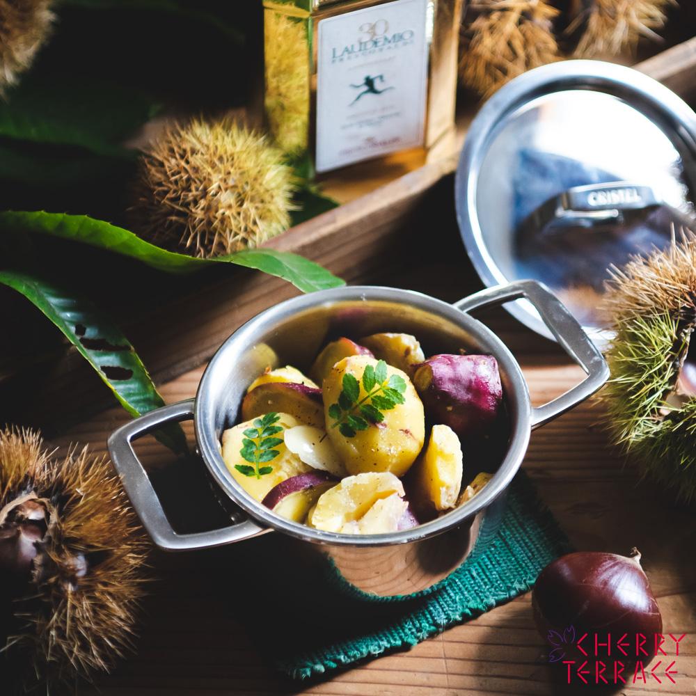 - 小さな鍋に栗、さつまいもを入れ、包丁でつぶしたにんにく、塩、ラウデミオを全体にさっとかけ、蓋をして弱火で10分〜蒸し焼きにする。