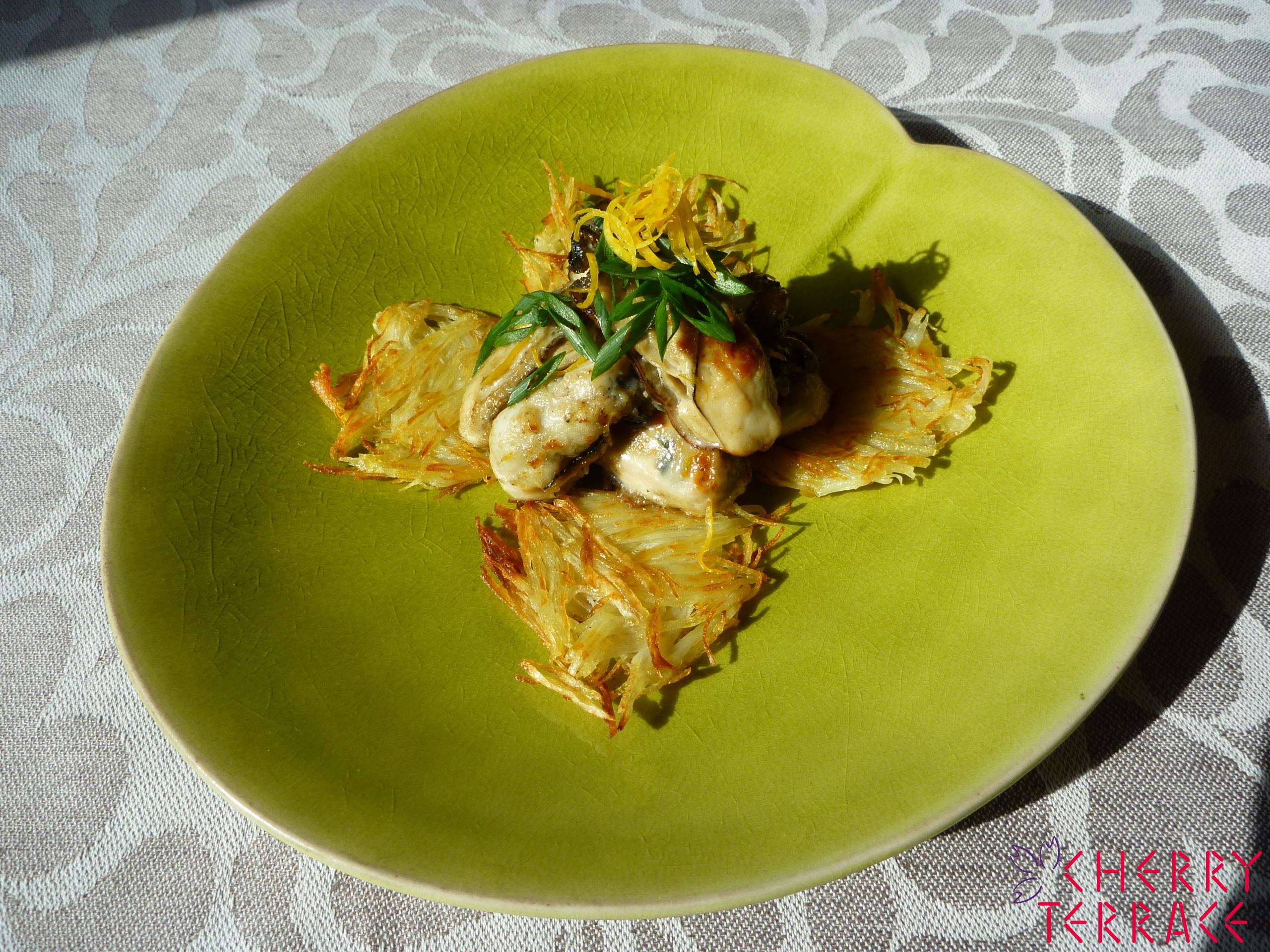 • クリステルフライパンに、バターを入れて熱し、塩、こしょう、小麦粉をふり牡蠣をさっとソテーし、ゆずの皮半量を加える。
