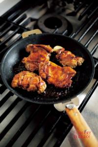 - 鶏肉から水分がにじみ出たらさっと水で流して拭き取る。植物油とにんにくをクリステルフライパンに入れ、弱火で温める。にんにくの香りが出たら鶏肉の皮目を下にして並べ入れ、蓋をして、中火で4、5分蒸し焼きする。皮がこんがりと焼けたら上下を返し、さらに3、4分焼いて火を通す。