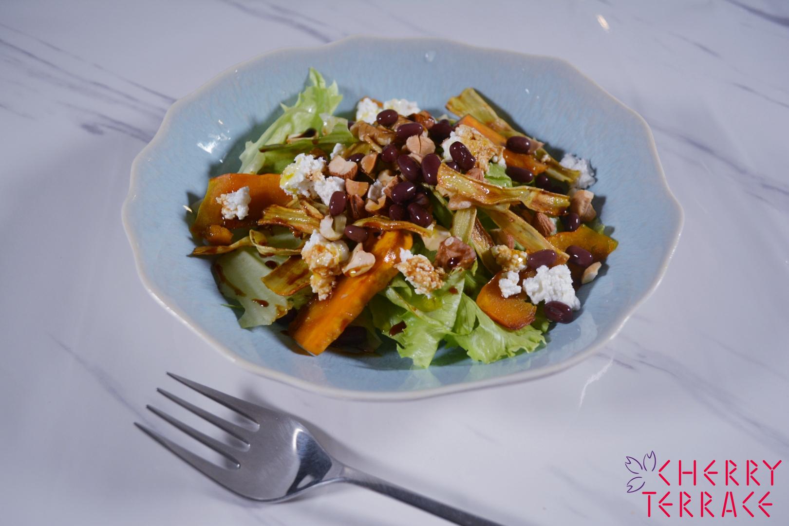 レタス、揚げ焼きにしたごぼうとかぼちゃ、ミックスナッツ、カッテージチーズなど、身体に嬉しい材料をいろいろ組み合わせたサラダです。なかでもトッピングに塩ゆであずきを加えるだけで食物繊維の摂取量は1.4倍に!腸内環境を整えるのにぴったりですね。
