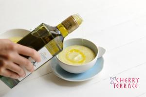 - 火を止めバーミックス(ミンサー)でなめらかにつぶし混ぜる。再び火にかけ、豆乳を加え、塩、こしょうで味を調え、ラウデミオをかける。