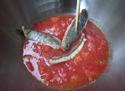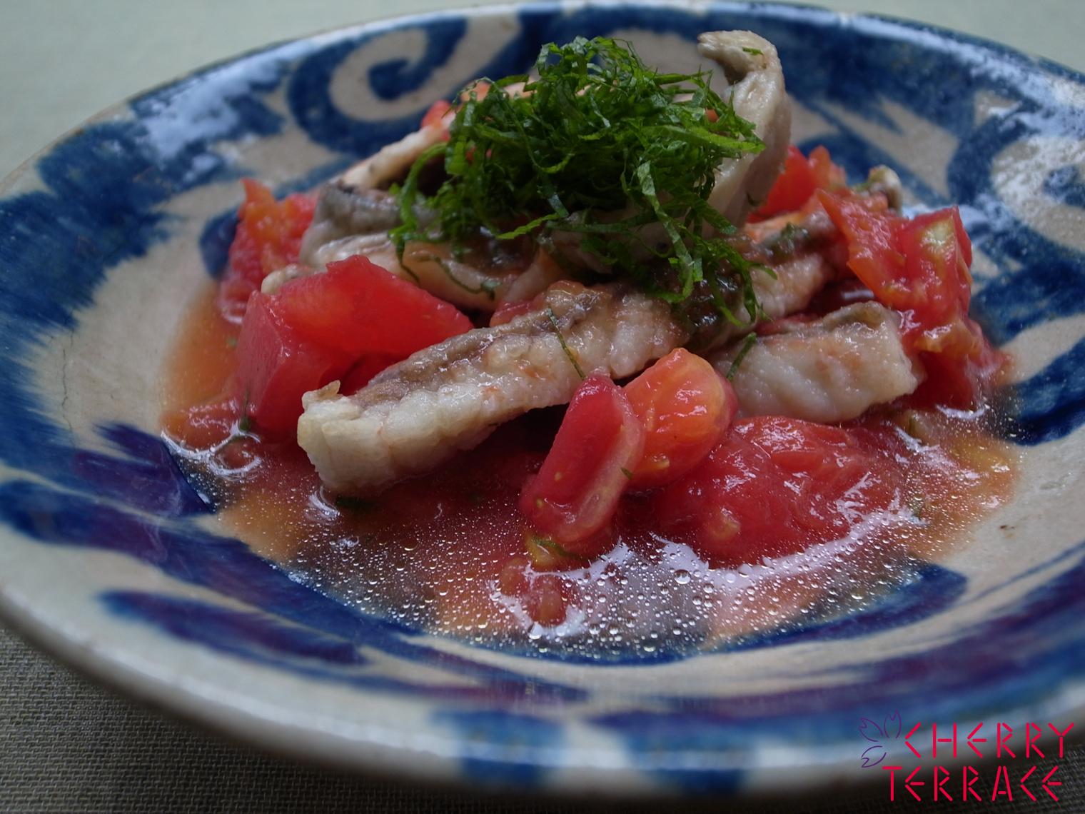 - トマトは小さく切り、電子レンジに2〜3分かけ、1に入れて、スプーンなどで軽くつぶし、しその千切りも加えて、マリネ液を作る。少し置いた方がおいしくなる。