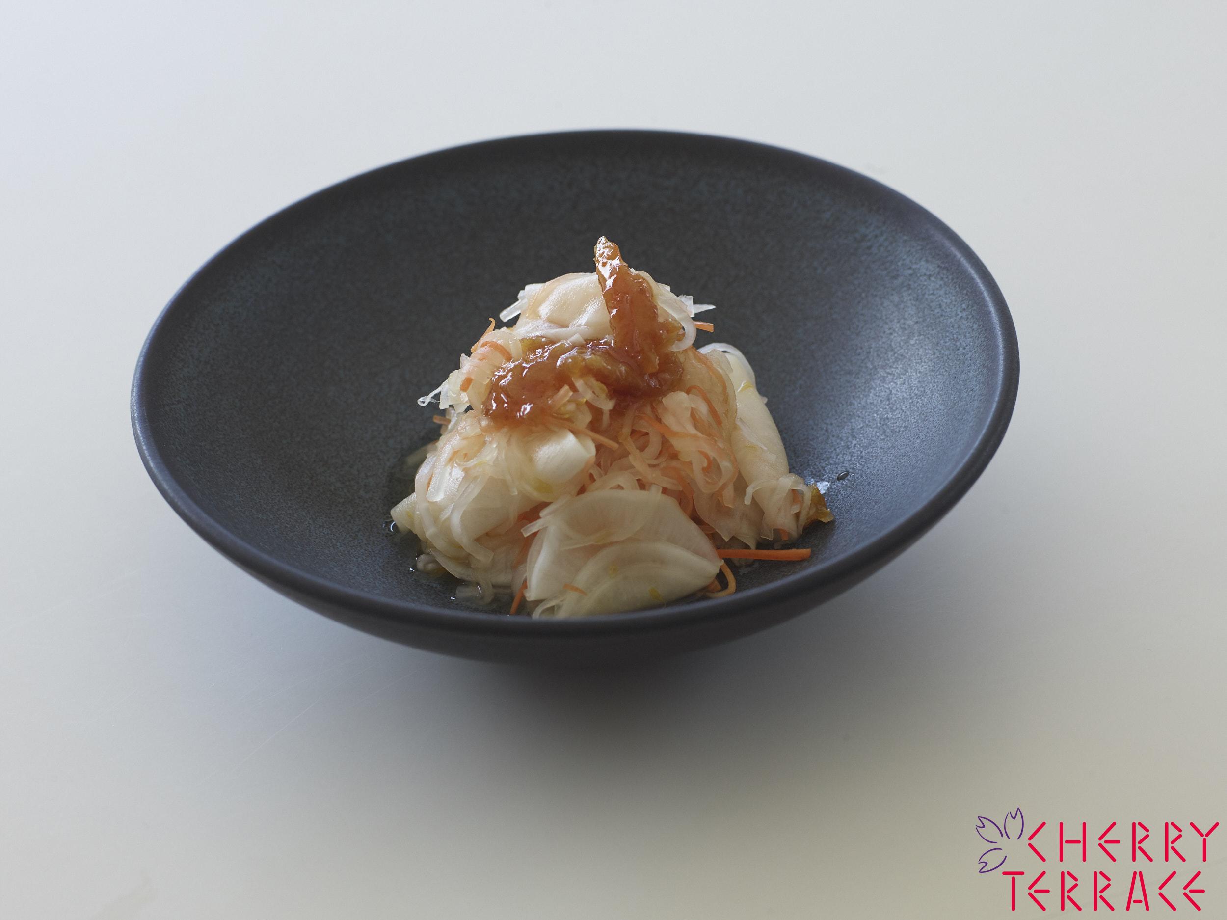 - ボウルに入れて塩をふってなじませる。少し水分が出てきたら、酢を加えてなじませ、マーマレードを加えて和える。