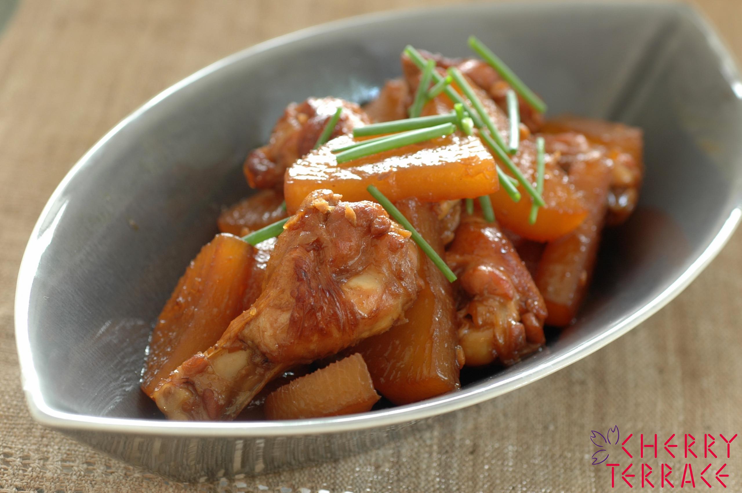 - クリステル中華鍋24cmまたは28cmに植物油少々を熱し、鶏肉を炒める。こんがり焼き色がついたらしょうが、大根を加えて炒め合わせる。