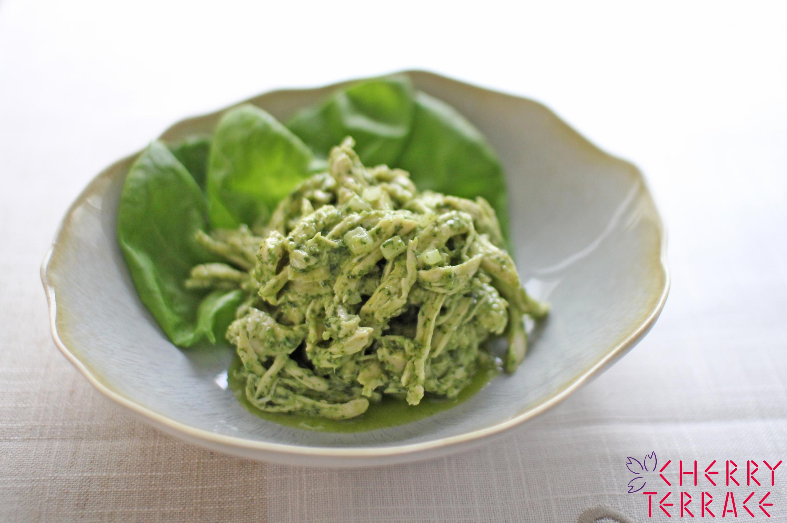 あの鶏胸肉が本当にジューシーに!バジルソースとマヨネーズで和えるだけ!そのまま食べてもサンドイッチとして挟んでも。