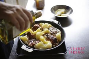 • じゃがいもの皮をむいて、途中まで包丁を入れて、手で割るようにして2、3等分にラフに分け、鶏肉の間を埋めるようにしてじゃがいもを置く。鶏肉の上にタイムを混ぜた蜂蜜を塗り、全体に塩を振ってオーブンへ。鶏肉にしっかり焼き目がつくまで8~10分くらいで焼き上げる。熱いうちにそのまま食卓へ。