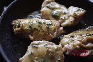 • クリステルフライパンラウデミオを入れて弱火にかけ、温まって来たら鶏肉の皮目を下にして中火でふたをして焼く。4、5分経ったら焼き色を見て、軽めに色がついていたら上下を返してさらに焼く。2、3分で一旦火を止め蓋をしておく。オーブンを210度に温める。