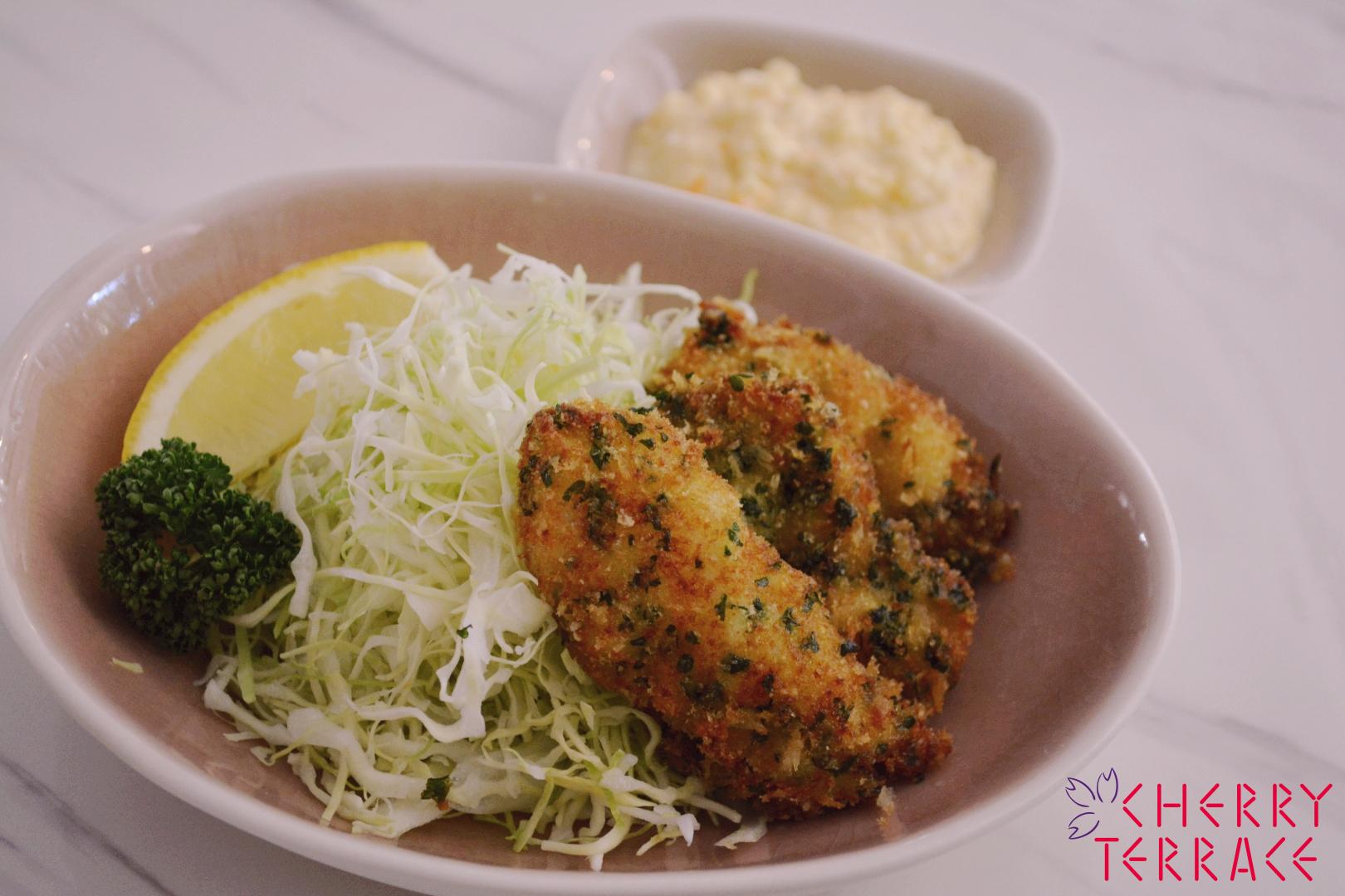- 揚げたてのかきフライにキャベツサラダとタルタルソースを添える。好みでかきフライやサラダにレモンを絞りながらいただく。