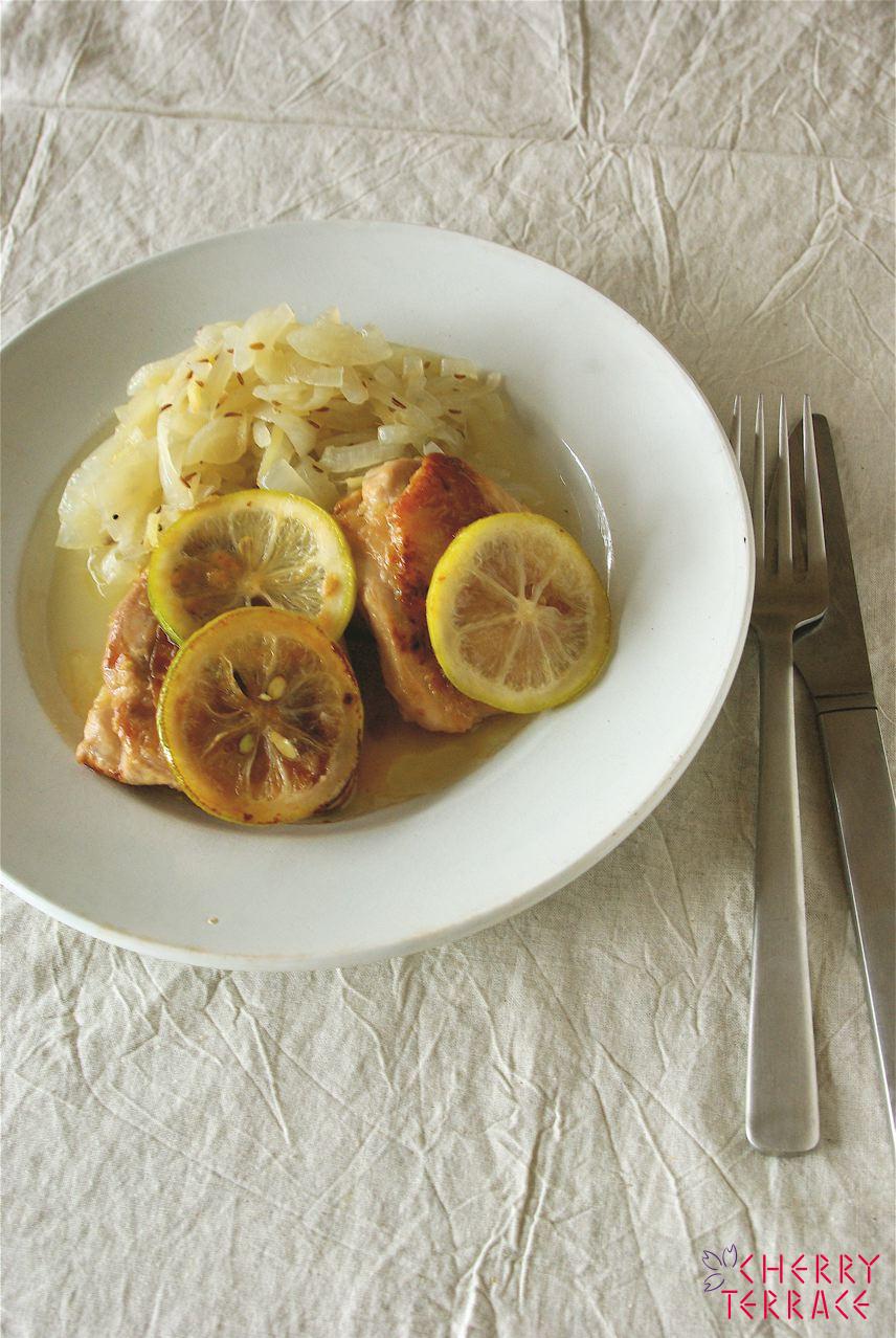 レモンでマリネしたチキンソテー。ぜひ、「クミン風味玉ねぎの蒸し煮」を添えて!好みで、レモンの香りとよく合うタイムやローズマリーの風味を加えるのもおすすめです。