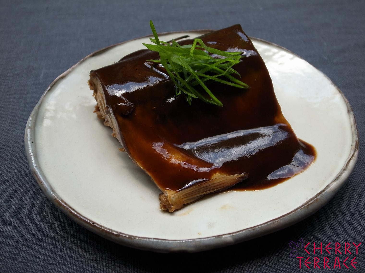 • 再び煮立ったら、アクを取って、煮汁を何度かすくって、さばにかける。