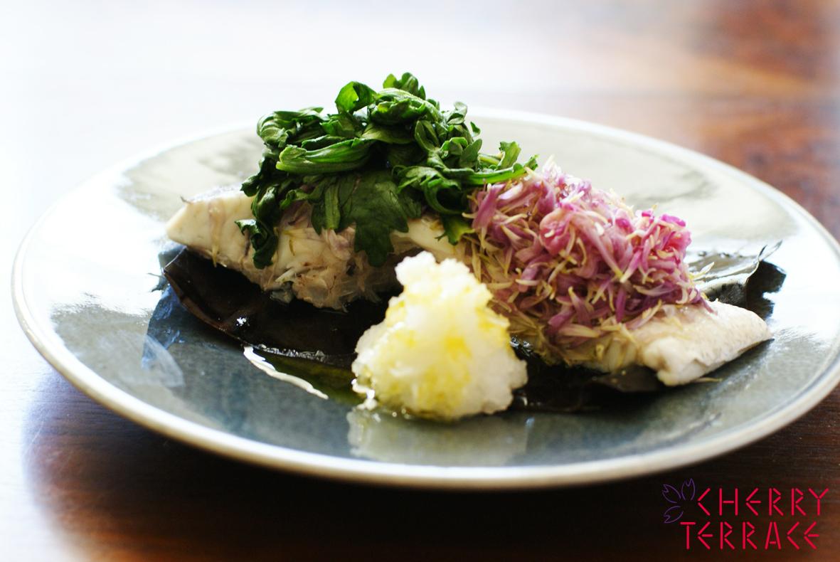 - 2の上に1をのせ、酒をふり、クッキングバスケットに並べる。クリステル深鍋22cmにクッキングプレートを置き、水を1cmの高さに入れ中火にかけて蒸気をあげる。バスケットを入れ、ふたをして、5から6分蒸す。ふたを開け、菊菜と、もって菊をのせ、1分ほど蒸したら火を止める。余熱で菊菜ともって菊に火を通す。