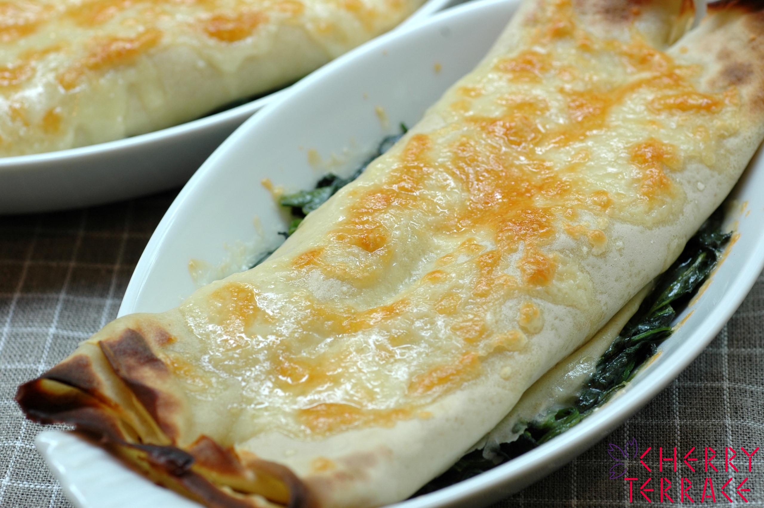 - グラタン皿にほうれんそうを敷き、フィリングをクレープで包んでのせチーズをふり、200℃のオーブン(またはオーブントースター)で約5分、色づくまで焼く。