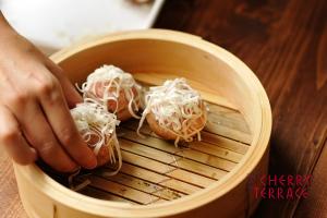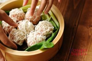 - しいたけの軸を取って1の肉をこんもりと盛り、焼売の皮をせん切りにしたものをのせる。