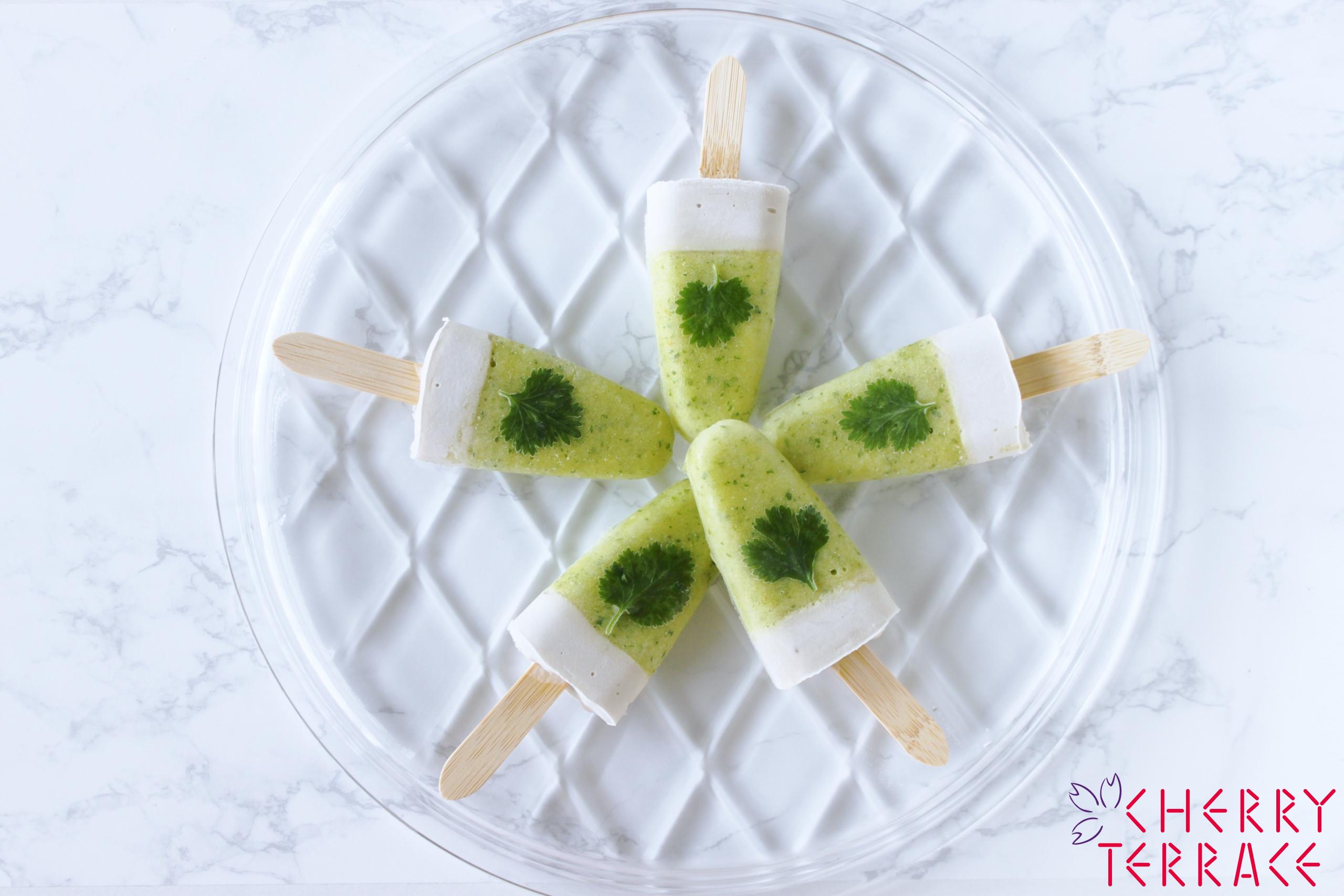 パクチーとココナッツミルクの2層のノンシュガーアイスバーです。抗酸化力の高いパクチーと食物繊維が豊富なパイナップルとココナッツミルクの整腸作用、美肌効果が期待できます。