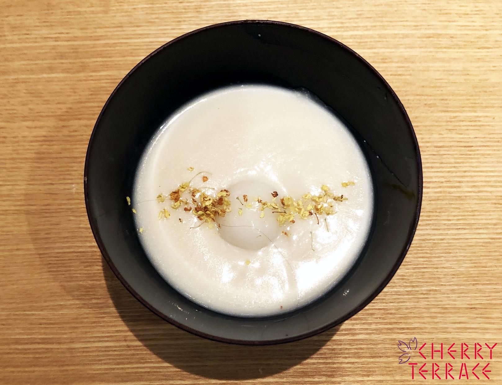 - 3を器に注ぎ、白玉をのせ、金木犀を散らす。