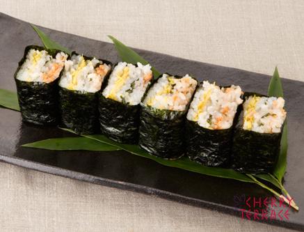 - 流し缶にラップを敷き、3の酢めしを1cmくらいのせ、2のそぼろ卵を散らす。さらに酢めし、しそ、酢めし、鮭そぼろ、酢めしの順に重ねる。ラップをかけ、上からぎゅっと押し、等分に切って周囲をのりで巻く。