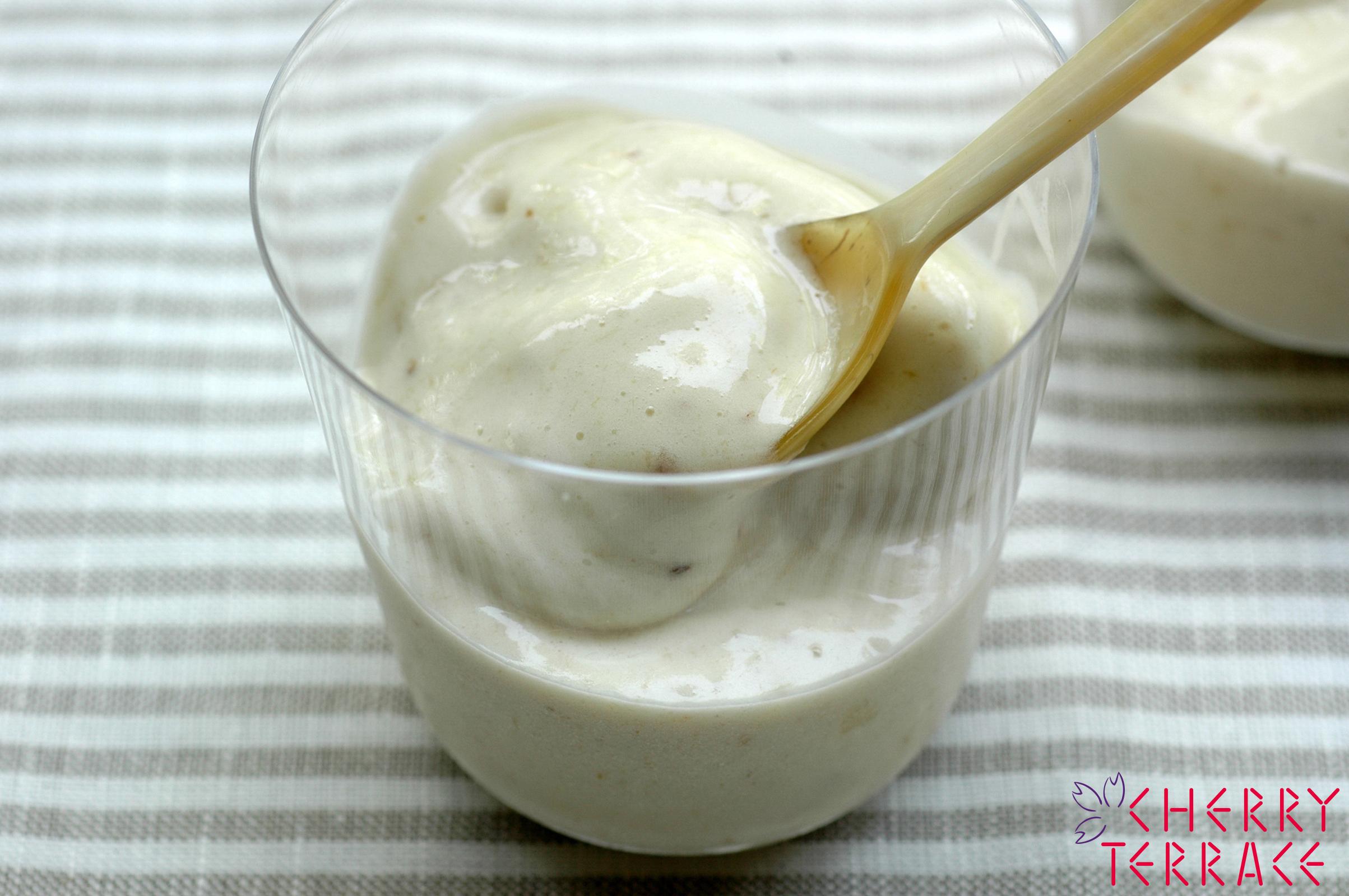 - 1と豆乳、砂糖をジャグに入れ、バーミックス(ミンサー)でつぶし混ぜてアイスクリーム状にする。