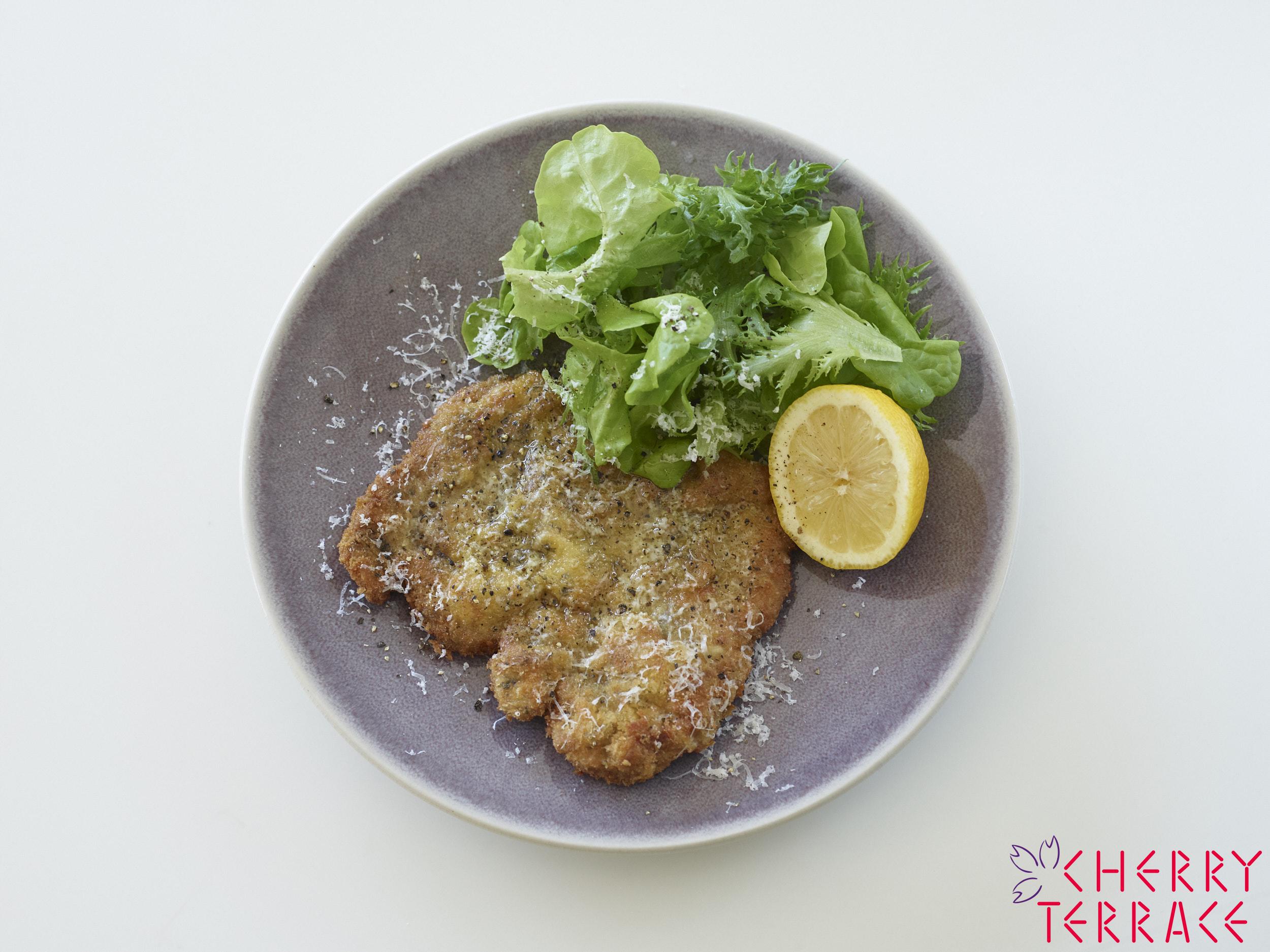 豚肉を少量の油で揚げ焼きにするミラノ風カツレツ。レモン汁、パルメザンチーズをかけた後、ラウデミオを垂らすとそれぞれの味がひとつにまとまります。ラウデミオを最後にかけることで、ひと味違うおいしさを楽しめます。パン粉作りにはバーミックスが活躍。グラインダーを使えば、あっという間に出来上がります。