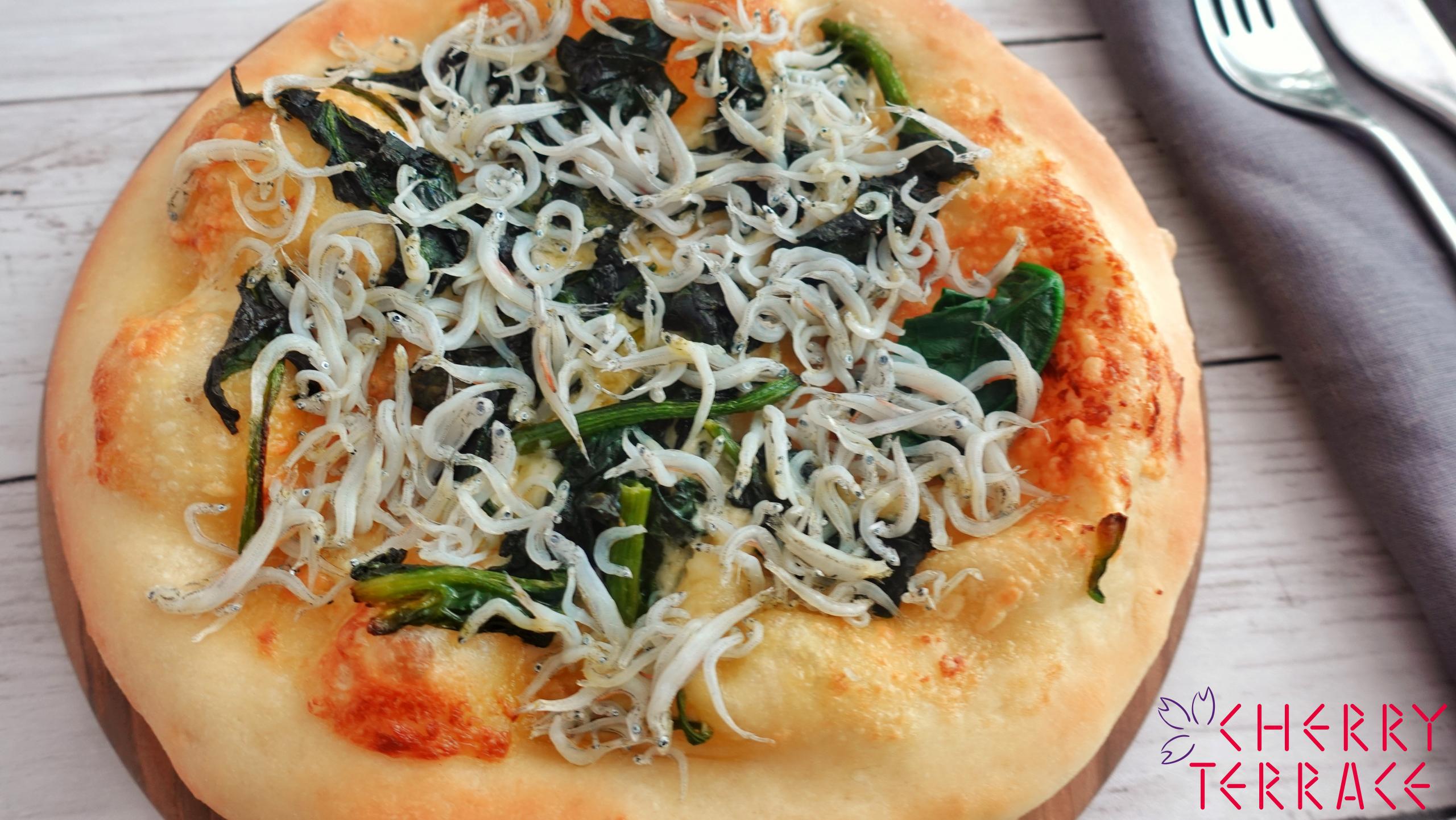 - 焼き上がりの2分前に1度取り出し、しらすをたっぷりと載せ、仕上げる。