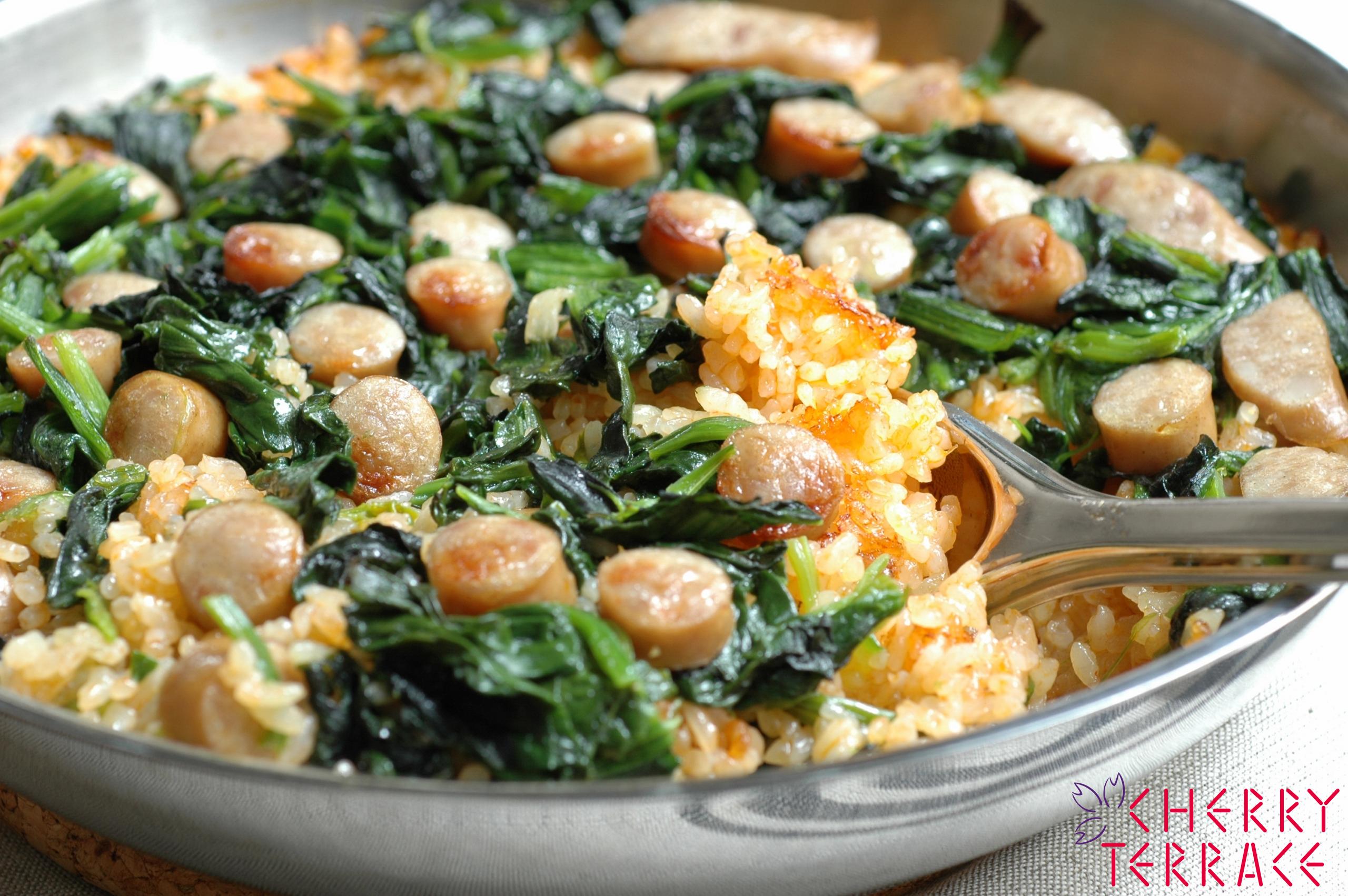 - 温めたチキンスープを注ぎ入れ、火を止める。1のほうれん草、ソーセージをのせ、蓋をして中火にかける。沸騰したら弱火にして10〜12分炊き(※)、火を止めて10分蒸らす