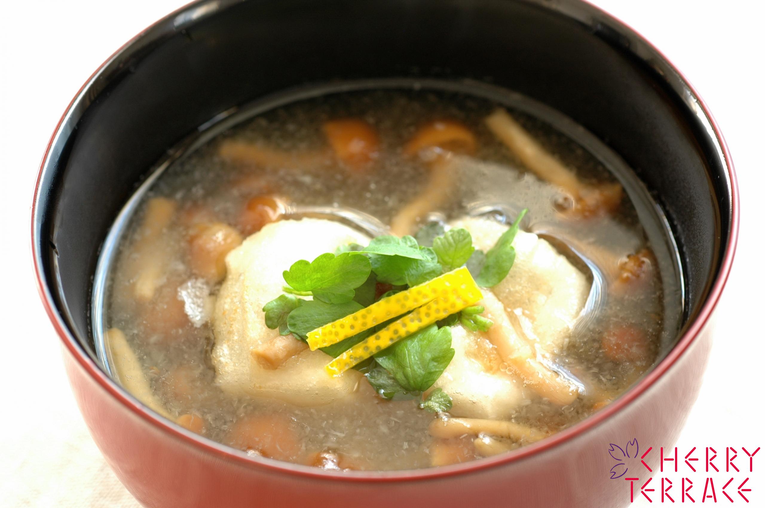 • 切り餅を揚げ、器に入れて2を注ぎ入れる。せりとゆずを飾る。