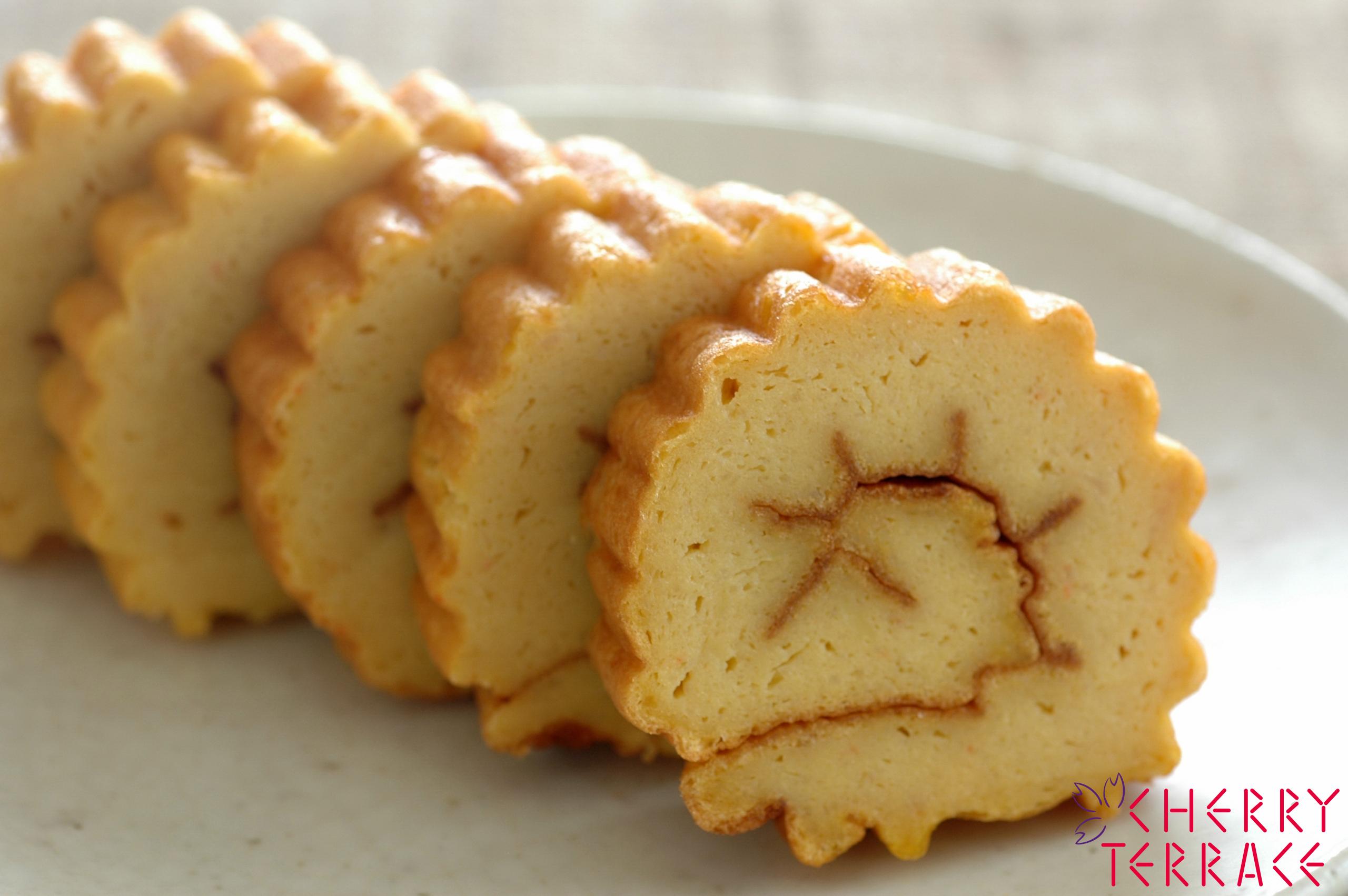 - 水にくぐらせた鬼すだれの上に底面を上にして置き、端からきっちりと巻いていき、両端を輪ゴムでとめる。すだれを立てた状態で完全に冷ます。