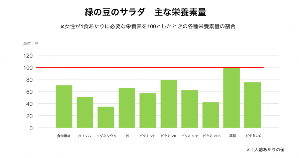 春が旬の様々な豆が入った緑の豆のサラダは、食物繊維や鉄分、葉酸、ビタミンCなど不足しがちな栄養素をしっかり摂る事ができます。植物性食品に含まれる鉄は、ビタミンCと一緒に摂ると吸収率が上がるため、両方の栄養を含むそら豆などの豆類は非常に優秀な食材といえます。