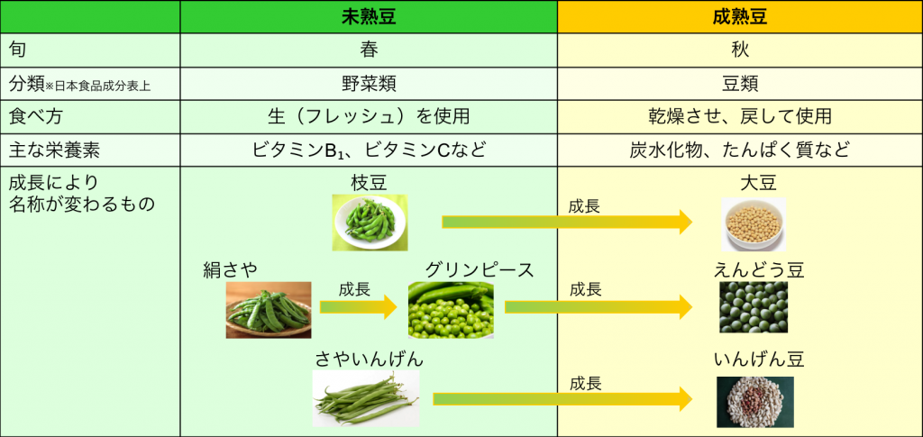 豆は大きく分けて「未熟豆」と「成熟豆」に分類されます。未熟豆は主に緑色で、そのほとんどがさやごと食べることができます。一方成熟豆は中身の豆のみを食べます。また、栄養素も成長するにつれて変化します。未熟豆はビタミンB₁やCなどの水溶性ビタミンを多く含むのが特徴なのに対し、成熟豆は炭水化物やたんぱく質を多く含みます。この中身の違いにより、同じ豆でも未熟豆は野菜に分類されています。また、豆類の面白い点は、出世魚のように成長に応じて名称が変わる事です。下記表の通り、成長により名称や味、食感や栄養等が変わるのは、豆類ならではの魅力です。