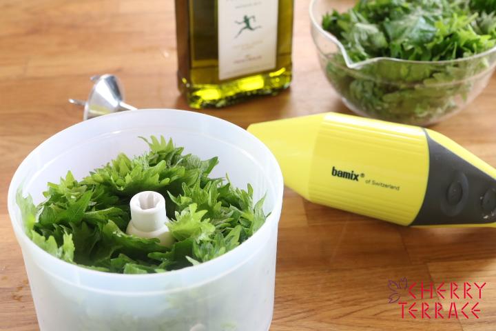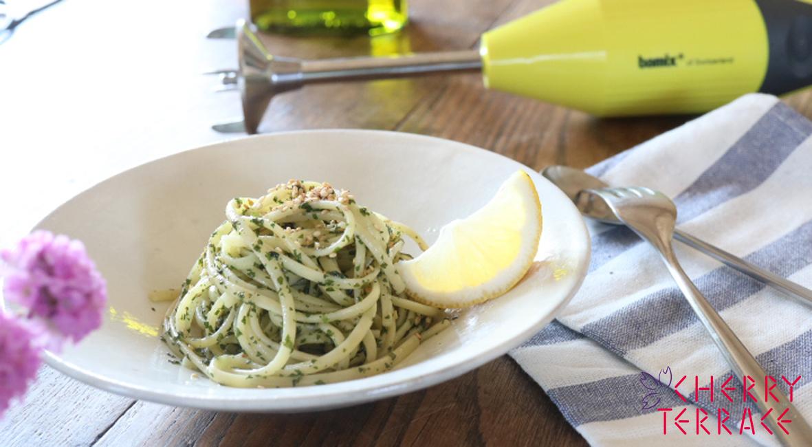 大葉と白ごまを使用してバーミックスで仕立てた大葉ジェノベーゼは、手作りならではの香り高さを楽しめる一品です。栄養価も高く、不足しがちな食物繊維やカルシウム、また抗酸化作用のあるビタミンEは1/2日分摂取することができます。通常ジェノベーゼは松の実を使いますが、手軽に手に入る白ごまで作る事ができます。大葉以外にも、春菊やパクチー等、様々な食材で旬のジェノベーゼをお楽しみいただけます。