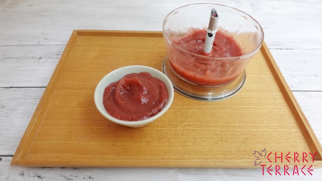 ① 梅干しの種を取りレゼルヴァと一緒にバーミックス(グラインダー)でペースト状になるまで混ぜる(梅干しの塩分濃度に合わせてお好みでレゼルヴァを加えてください)。