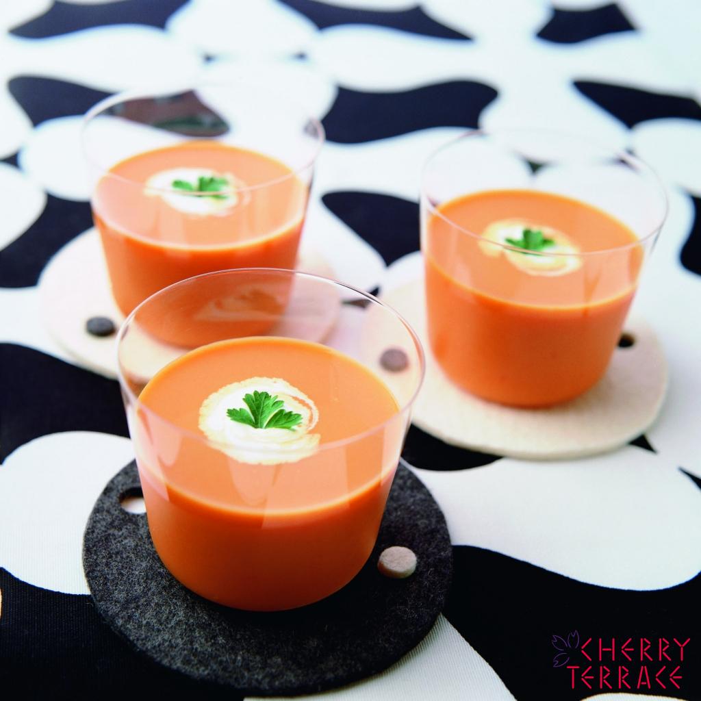 赤パプリカの冷静スープは、赤パプリカと玉ねぎをクリステルでバターと共に弱火でじっくり炒めバーミックスでなめらかに仕立てます。スープに含まれるビタミンAやビタミンEは油と一緒に摂ると吸収しやすくなりますので、おすすめの食べ方となります。トマトの冷静スープと比べると、ビタミンEは約3倍、ビタミンCは約5倍多く摂る事が出来ます。ビタミンAとC、Eは抗酸化ビタミンと呼ばれていますので、夏の疲れが出てきたときに、食べやすくおすすめの一品です。