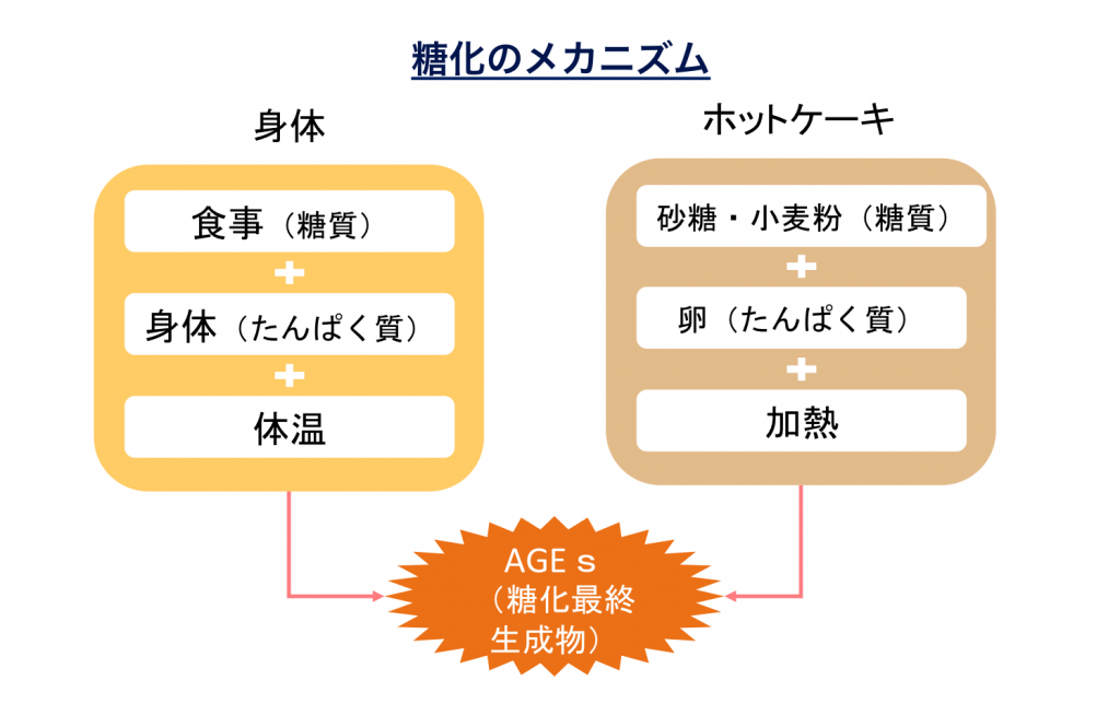 ホットケーキを焼くと茶色い焼き目がつくように、人の身体も甘いものを食べすぎると太ったり、糖尿病に罹りやすくなるほかに、老化も促してしまいます。ですが、糖質はエネルギーのもとになるものなので、上手に向き合いたいものです。