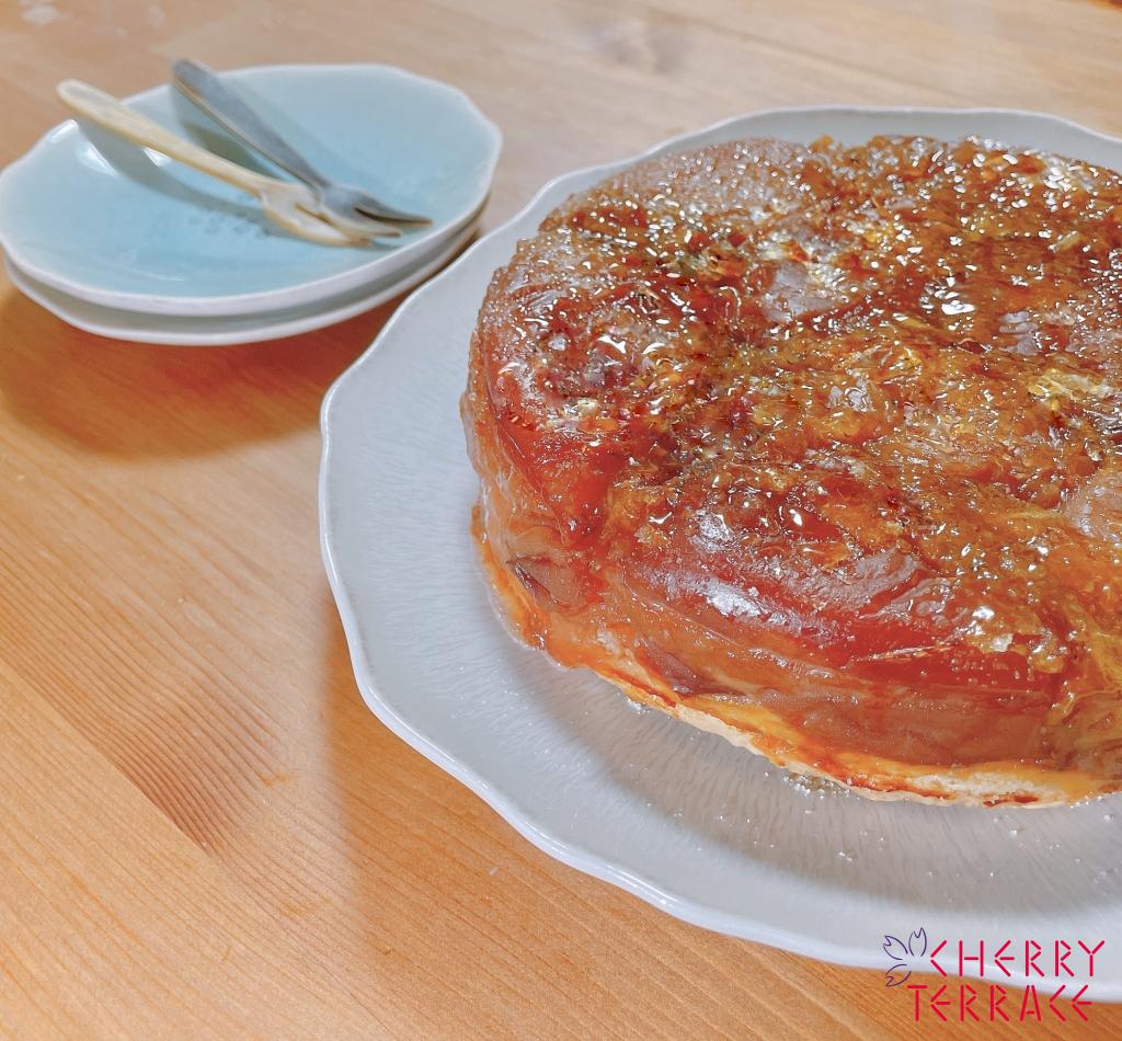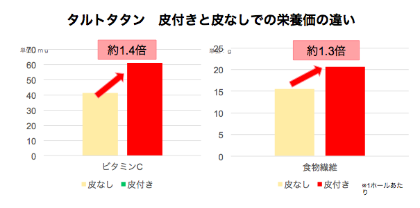 欧米では、昔から「一日一個のりんごは医者を遠ざける」といわれており、りんごに含まれる栄養素が注目されています。その代表的なものとして、ポリフェノールが挙げられます。りんごを切ってしばらく経つと茶色に変色しますが、これはポリフェノールのプロシアニジンによるもので、強い抗酸化作用があるといわれています。また、皮ごと食べると、皮に含まれるアントシアニンというポリフェノールも摂ることができます。体の中で活性酸素が発生すると、生活習慣病や老化を引き起こすだけではなく、免疫機能の低下にも繋がるため、ポリフェノールの詰まったりんごを食べることはウイルスに負けないからだ作りに一役買ってくれそうですね。その他、健康や美容の維持に必要とされてれるビタミンCや食物繊維も皮をむいた状態より皮つきの方が多く摂取することができます。りんごのデザートの代表である「タルトタタン」も皮つきで作られると、グラフのように栄養価が高くなることが分かります。