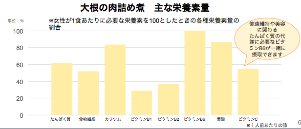 おろしやサラダ、和え物に、おでんや煮物、汁物に、切り干し大根、沢庵に…いろんな姿に形を変える大根です。一年中出回ってはいますが、やはり今の時期の大根は水分が豊富で、柔らかく、辛味も弱いので、煮物にするには最適です。おでんやふろふき大根にすると、中まで煮汁が染み込み、食べるだけで体が温まります。大根の肉詰めは、肉の旨みが大根にしみて美味しくなると共に、肉のタンパク質を代謝するために必要なビタミンB6も一緒に摂取ができる組み合わせとなります。