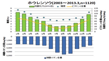 冬野菜の代表格であるほうれん草。栄養価は季節によって変動し、食味にも差があるといわれています。中でもビタミンC量と抗酸化力の差は大きく、冬のほうれん草には夏のほうれん草の約7倍の量が含まれています。ほうれん草のえぐみの原因となる硝酸イオン濃度は夏のほうれん草のほうが多く、冬のほうれん草は寒さにあたることによって、糖度が増しています。冬のほうれん草は美味しさと栄養価の両方を持ち合わせています。カルシウムや鉄といったミネラル、βカロテンやビタミンE、葉酸など各種ビタミンも豊富に含まれています。