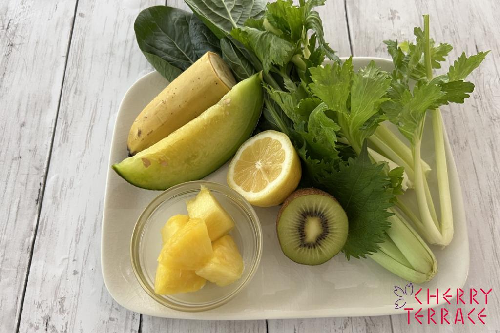 水分を多く含むウリ科のメロンを使用し、栄養価の高い小松菜や爽やかな酸味が特徴のパイン、アクセントに大葉を加え た、彩りも鮮やかな初夏のミネラルスムージーです。