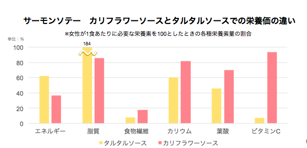 今回のレシピは、旬のカリフラワーでソースを作り、サーモンソテーとともに頂くメニューです。一般的なレシピで添えられることの多いタルタルソースと栄養価を比較すると、エネルギーは約40%、脂質は約50%もカットすることができます。また健康維持のために必要な栄養素である食物繊維は約2倍、ビタミンCは約13倍の量を摂ることができます。