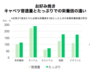 お好み焼きに入れるキャベツの量を通常のレシピにプラス50gすると、葉酸は約1.4倍、ビタミンCは約1.7倍にアップします。カロリーはほとんど変わりませんので、美味しく健康的にお食事を楽しめますね。