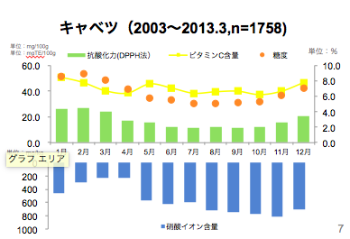 1年の中でキャベツの糖度が最も高くなるのは冬。反対にえぐみの原因となる硝酸イオン濃度は冬に少なくなります。また、ビタミンC量が多くなるのもこの時期です。旬のキャベツは栄養価が高く、美味しいという事がデータより読み取ることができます。