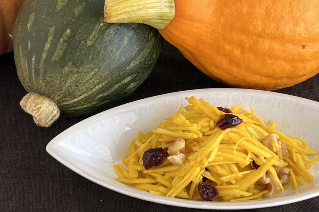 最近は皮が黄色~薄オレンジ色で皮ごと生食できるコリンキーといわれるかぼちゃも店頭でみかけるようになりました。シャキシャキとした歯ごたえで、バーミックス・スライシーで細切りにしてサラダや浅漬けなどにして食べるのがおすすめです。作り置きもできるのでコリンキーを店頭で見かけたら作ってみてください。