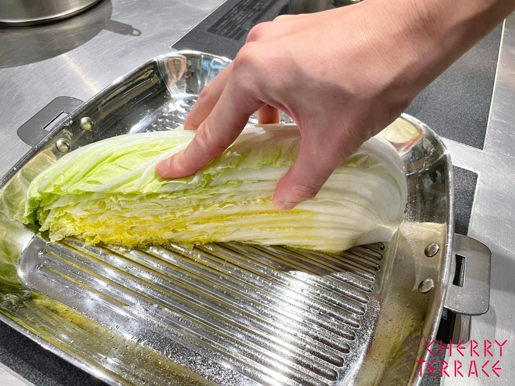 ① 白菜を1/4にカットしたものに塩、ラウデミオを軽く振りかけ、クリステルグリルパンで焼き目が付くまで丸ごと焼く。