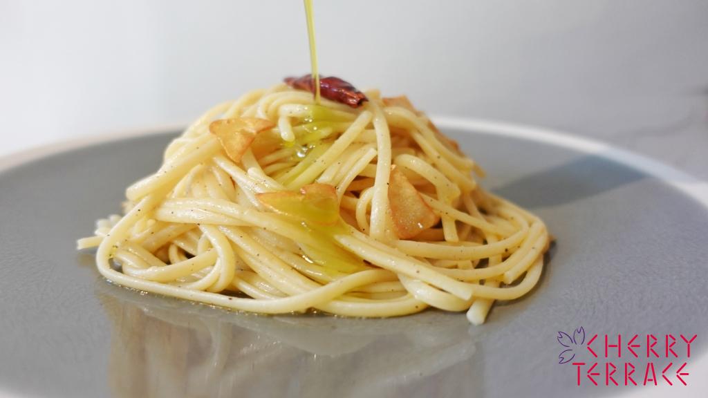 ペペロンチーノの仕上げにたっぷりとかけるだけ、ラッコルトが濃厚なソースになり、とてもおいしくいただけます。