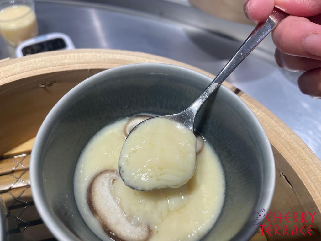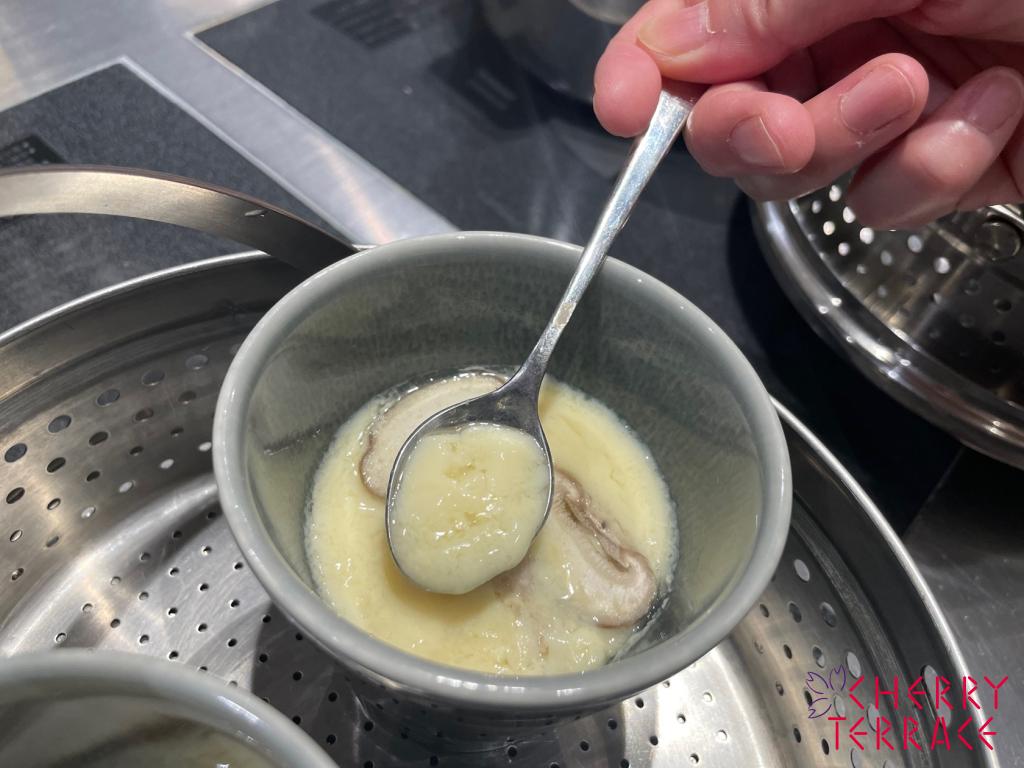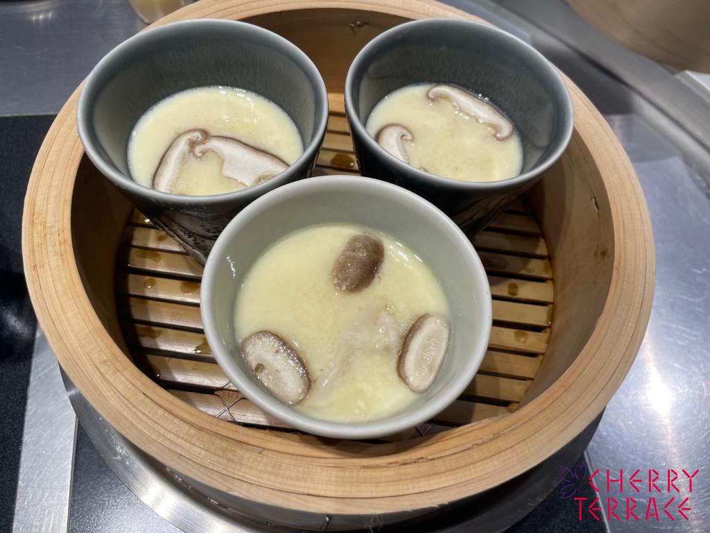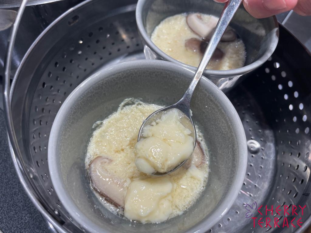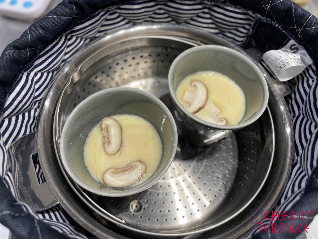 クリステル深鍋に水を入れ、スチームプレートをセットし、ひのきせいろ24cmをセットして湯を沸かす。沸騰したらせいろに茶碗蒸しを乗せて弱火で12分蒸す。
