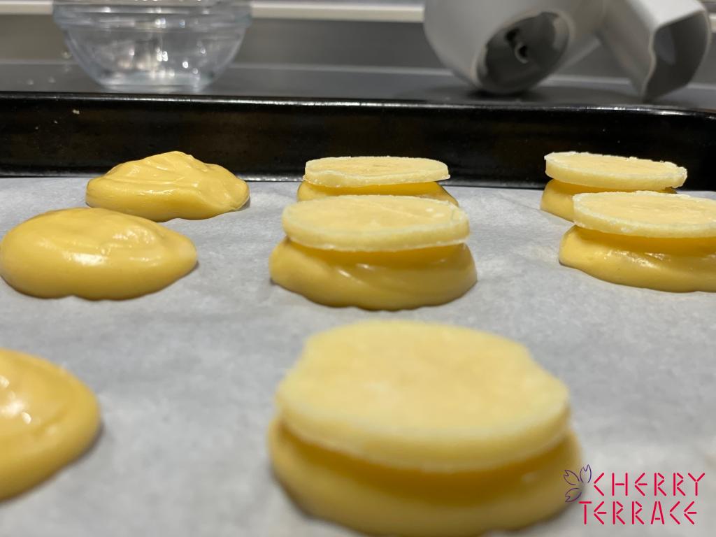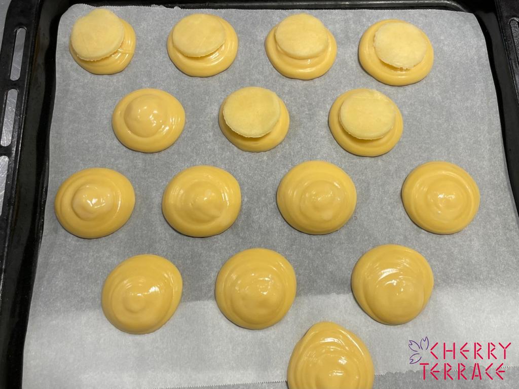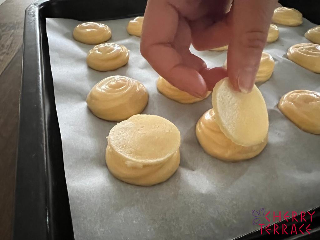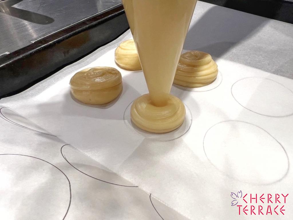 そうすることでシュー生地を絞った後すぐにクッキーを乗せることができます。