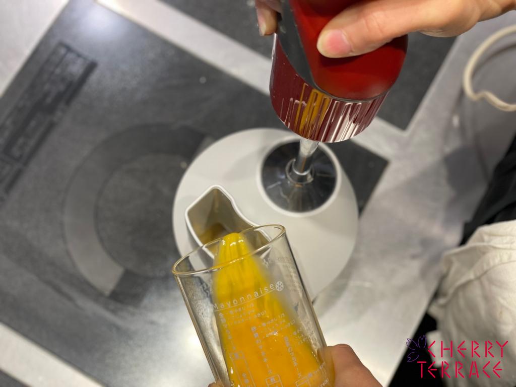 ③ バーミックス(スライシー/チョッピングナイフ)に投入口から溶き卵を少しずつ加え混ぜ合わせる。ヘラで生地をすくった時に三角形に広がり、スーッとゆっくり落ちるくらいが理想です。