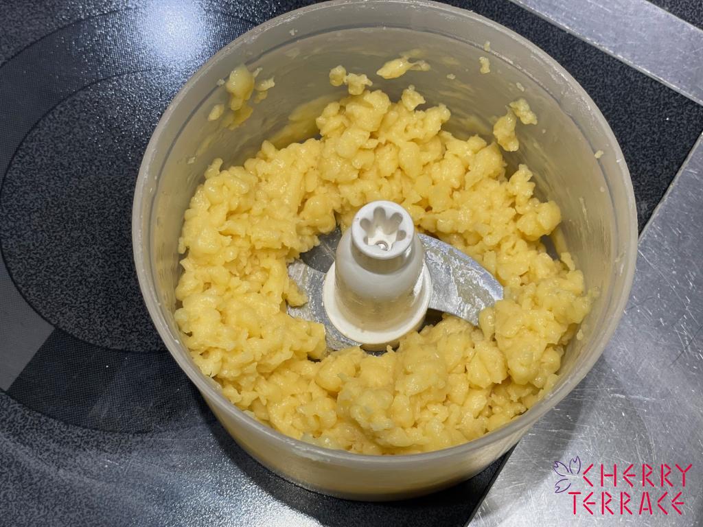 今回のレシピでは卵Lサイズ2個(110g〜120g)が理想の分量でしたが様子を見ながら少しずつ加えてください。