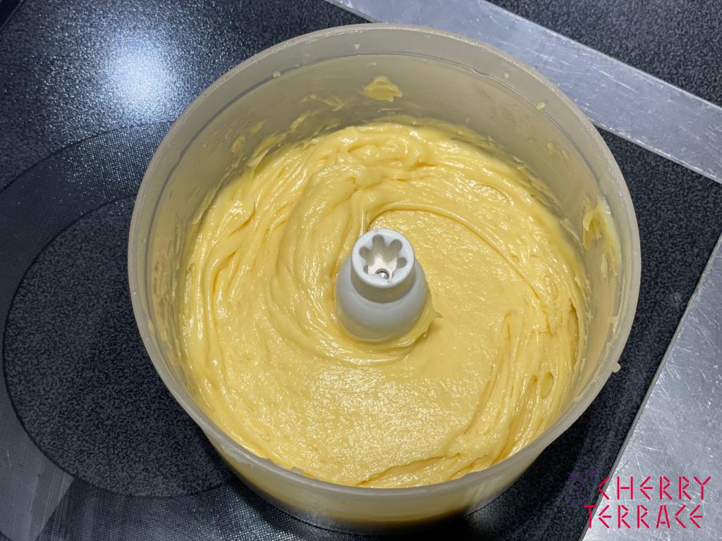 また、生地の温度が冷めると固くなり、絞り出しが難しくなってしまうので、人肌くらいの温度で調節するのも大事なポイントです。