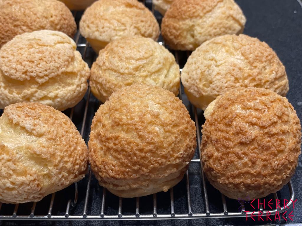 シュー生地の上にクッキー生地を乗せて焼くので、